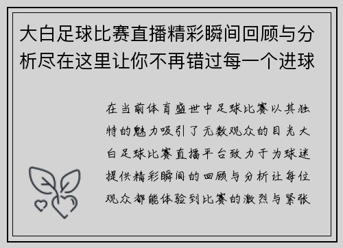 达孜区精彩足球比赛直播全程回顾与精彩瞬间分享,是对这场足球盛事的全面总结。本文将从四个方面进行深入探讨:首先,我们将回顾比赛前的准备工作,包括球队阵容、教练策略和赛前热身等;其次,将重点分析比赛过程中的精彩瞬间,记录每一个激动人心的时刻;然后,我们将讨论观众反应以及赛事对社区的影响;最后,还会展望未...